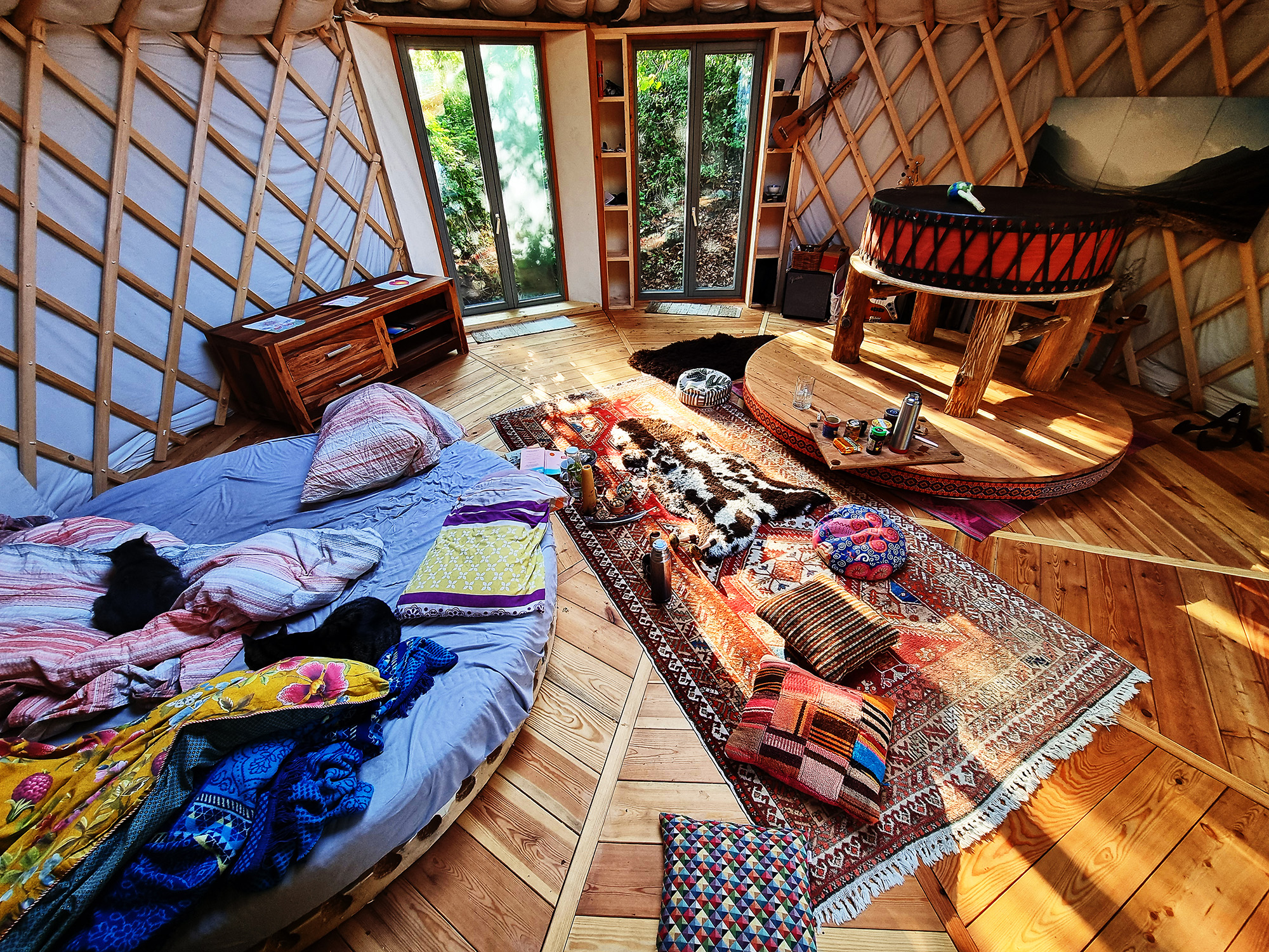 Viele unserer Besucher interessiert das Leben in der Jurte mit Kindern, mit Hund oder sogar als Hauptwohnsitz. Und ja – auch das Kochen in der Jurte, Schlafen in der Jurte oder das tägliche Miteinander funktioniert erstaunlich gut, wenn man sich auf das Leben im Kleinen einlässt.